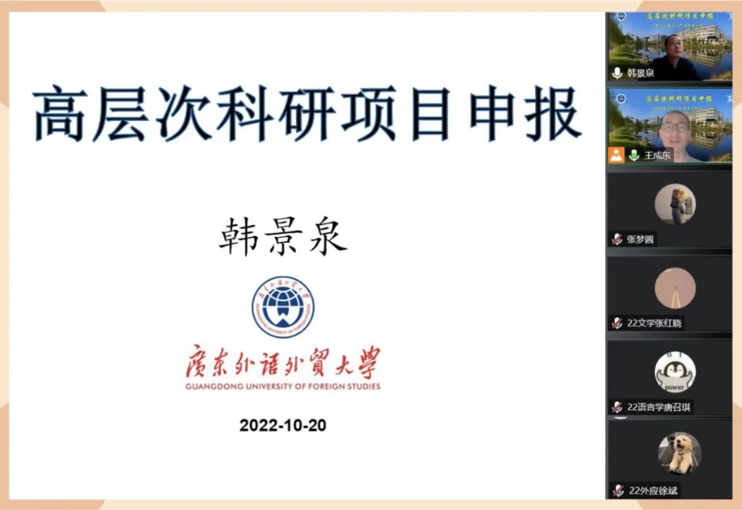 10月20日,廣東外語外貿(mào)大學韓景泉教授應(yīng)我校科研處和英語學院邀請,通過騰訊會議平臺為我院師生做了題為“高層次科研項目申報”的學術(shù)講座。本次講座為我院“外語學科融合發(fā)展”高端云講壇系列講座之一,由副院長王成東主持,我院部分教師及碩士研究生共同聆聽了此次講座。