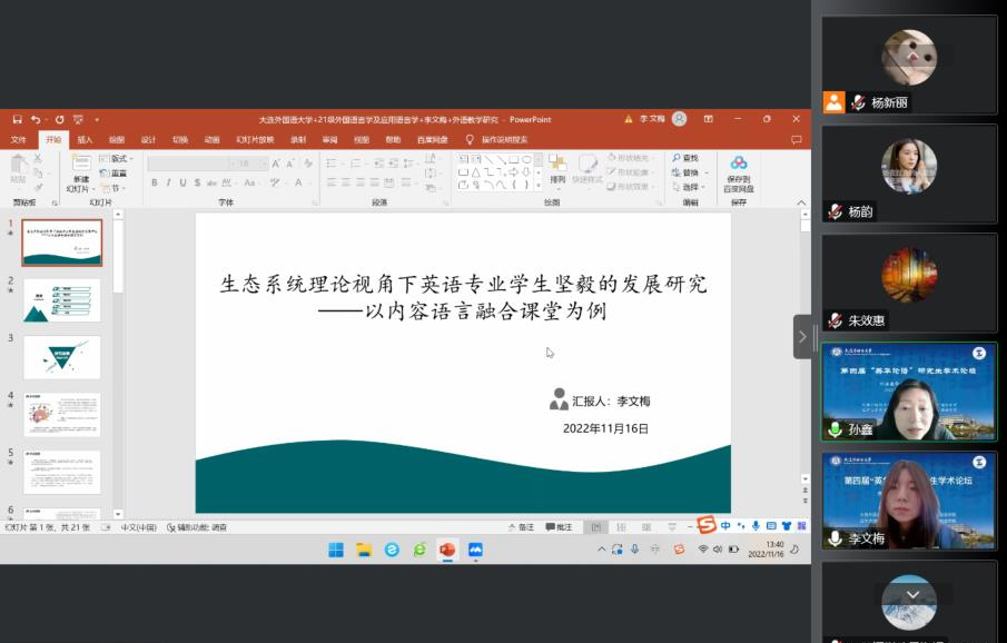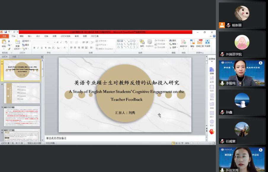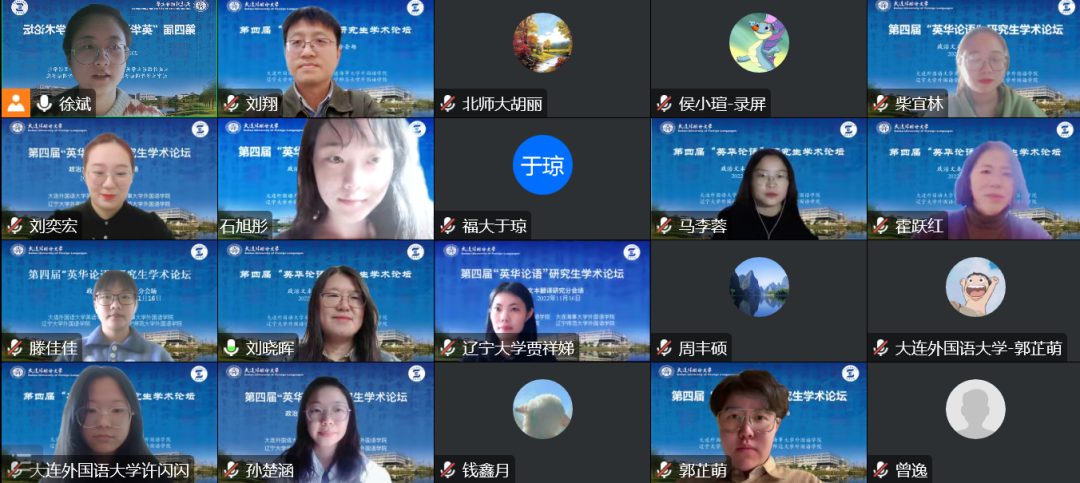 11月16日下午,第四屆“英華論語”研究生學術創(chuàng)新論壇在大連外國語大學成功舉辦。本次論壇由大連外國語大學英語學院、大連海事大學外國語學院、遼寧大學外國語學院、遼寧師范大學外國語學院聯(lián)合舉辦,旨在為研究生搭建高質量學術交流平臺,緊跟國家戰(zhàn)略,響應時代需求,突出思想性、科學性、交叉性與創(chuàng)新性,著力培養(yǎng)高層次創(chuàng)新型青年人才,為建設社會主義現(xiàn)代化強國提供有力的人才支撐。本次論壇采用線上模式進行,下設理論語言學研究、翻譯研究、政治文本翻譯研究、英美文學研究、數(shù)字人文研究、外語教學研究六個分論壇。