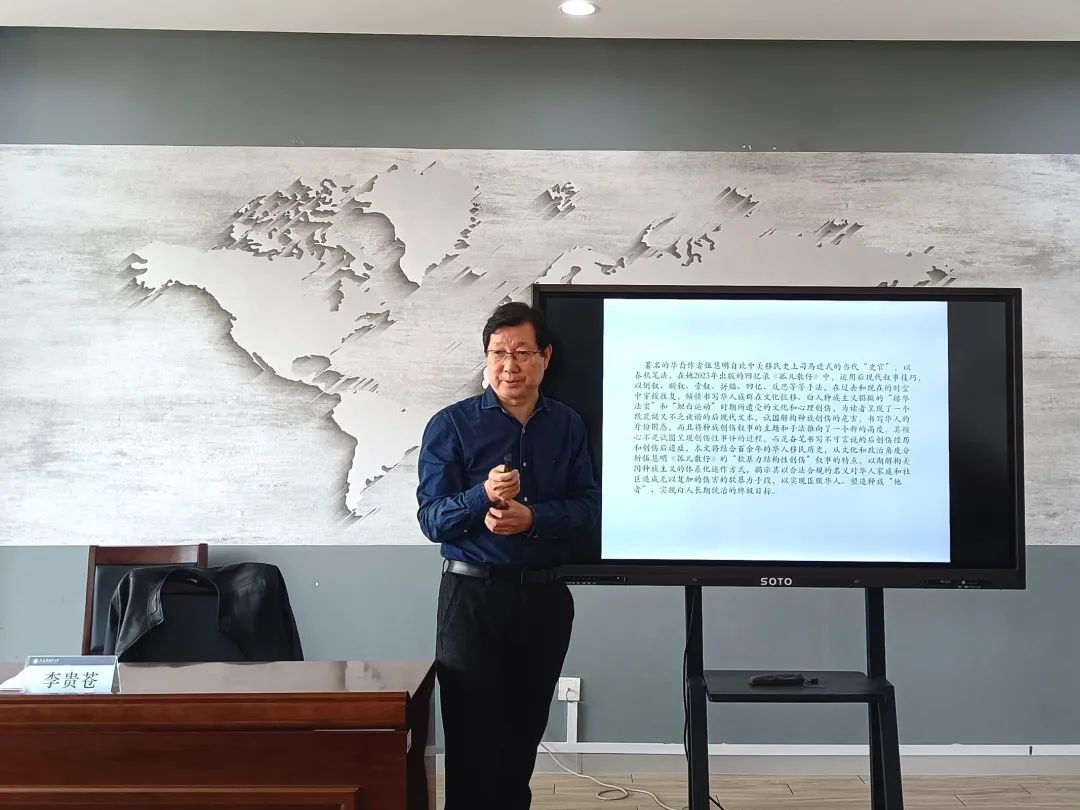講座伊始,李貴蒼教授根據(jù)自身經(jīng)驗分享了正確的讀書方式并指出了讀書的目的在于知識創(chuàng)新。隨后,李貴蒼教授講述了著名的華裔作者伍慧明自比中美移民史上司馬遷式的當(dāng)代“史官”,以春秋筆法書寫回憶錄,讓大家深刻理解了海外華人百余年的生活方式及其依托國家的真實現(xiàn)狀。最后,李貴蒼教授從文化和政治角度著重分析了《孤兒散仔》中“非暴力結(jié)構(gòu)性創(chuàng)傷”的特點,揭示了美國塑造種族“他者”以臣服華人,從而實現(xiàn)白人長期統(tǒng)治的終極目標(biāo)。