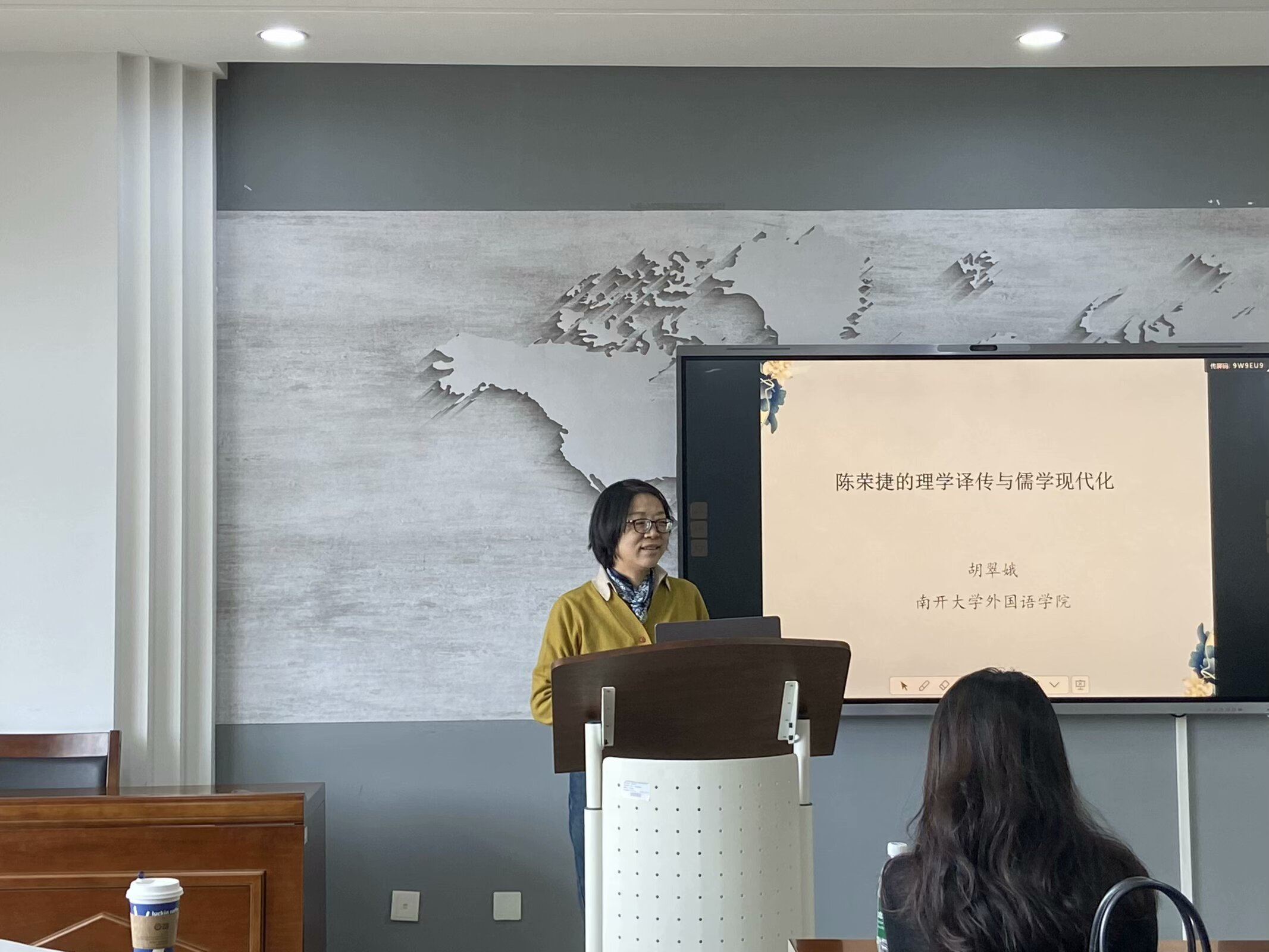 3月28日,南開(kāi)大學(xué)外國(guó)語(yǔ)學(xué)院胡翠娥教授應(yīng)邀為我院師生做了題為“陳榮捷的理學(xué)譯傳與儒學(xué)現(xiàn)代化”的學(xué)術(shù)講座。講座由英語(yǔ)學(xué)院副院長(zhǎng)劉曉暉主持,“東北亞學(xué)科群”重點(diǎn)學(xué)科方向團(tuán)隊(duì)成員、英語(yǔ)學(xué)院及法語(yǔ)學(xué)院碩士研究生參加了此次講座。