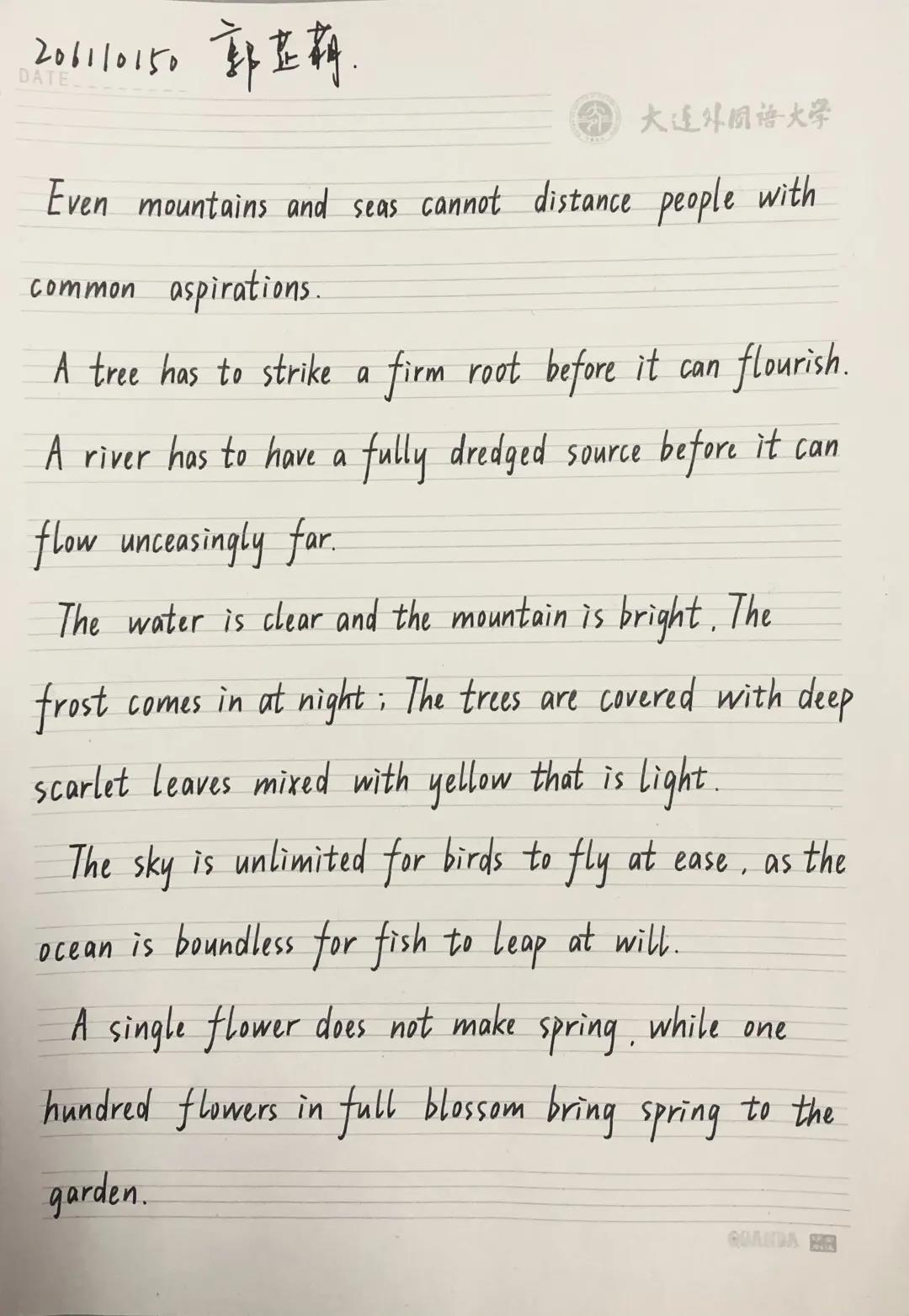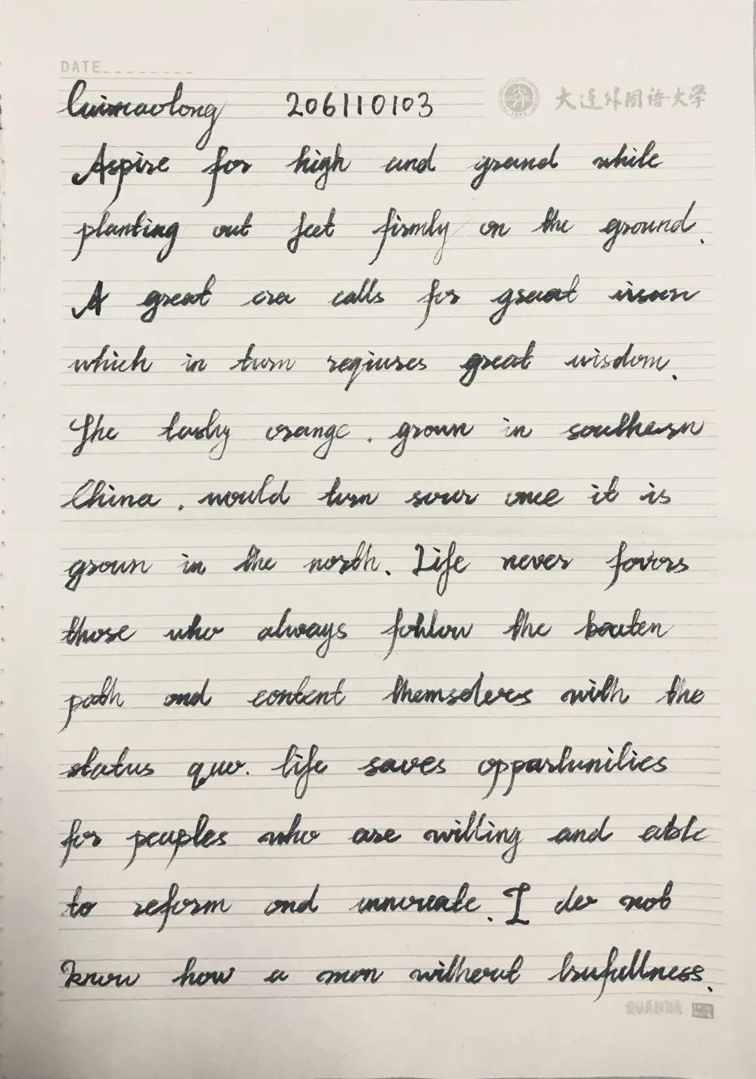 此次研究生中英文書法大賽不僅僅是一次有意義的書法藝術(shù)的盛宴,同時(shí)也是創(chuàng)新思維下新時(shí)代新思想與傳統(tǒng)文化的結(jié)合。通過此次比賽,同學(xué)們?cè)趯W(xué)習(xí)新思想的同時(shí),也回顧了中國燦爛悠久的歷史文化。植根于優(yōu)秀的傳統(tǒng)文化,才能在未來的學(xué)習(xí)與創(chuàng)新之路上一往無前。