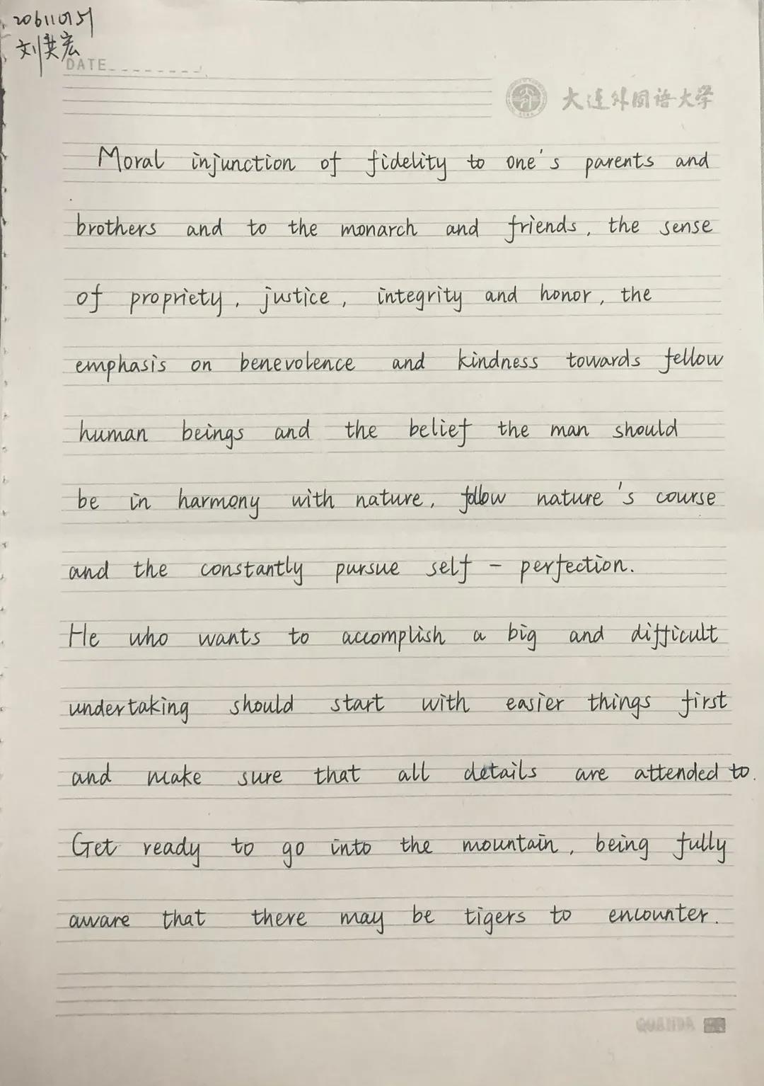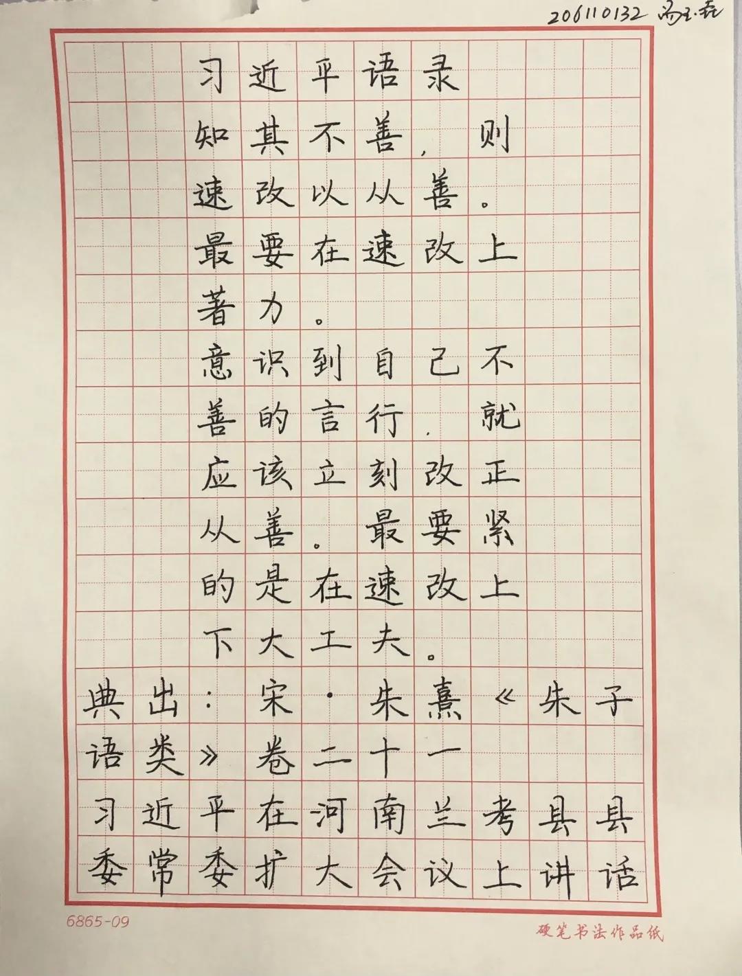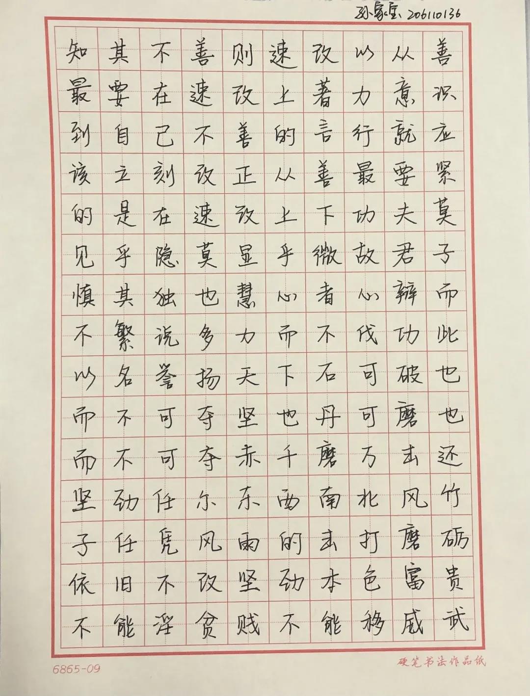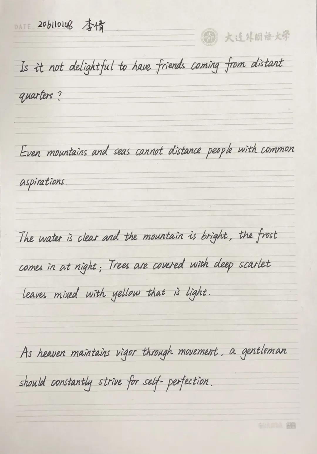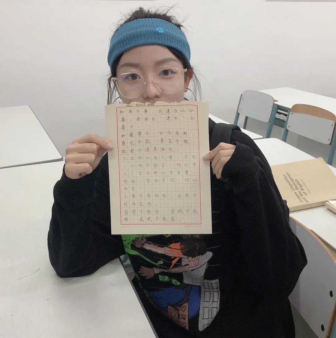 在書法大賽開始前,首先由生活部郭芷萌同學(xué)說明此次書法比賽的書寫格式及規(guī)則。隨著比賽的開始,所有參賽的同學(xué)都投入其中。有的同學(xué)聚精會(huì)神,胸有成竹;有的同學(xué)寫的小楷一筆一劃,認(rèn)真專注;有的同學(xué)筆下的行書氣韻生動(dòng),一氣呵成。一幅幅頗具神韻的書法作品中既懷有同學(xué)們對(duì)中國傳統(tǒng)文化向往,更展現(xiàn)了習(xí)近平新時(shí)代中國特色社會(huì)主義思想的風(fēng)貌。除了中文硬筆書法之外,也鼓勵(lì)大家積極參與到賽后英文書寫的評(píng)比,籍英文之美傳達(dá)新思想與新理念。