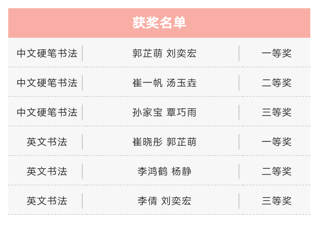 經(jīng)過評(píng)委老師的評(píng)比商議,此次中英書法比賽分別評(píng)選出一、二、三等獎(jiǎng)各兩位同學(xué)。