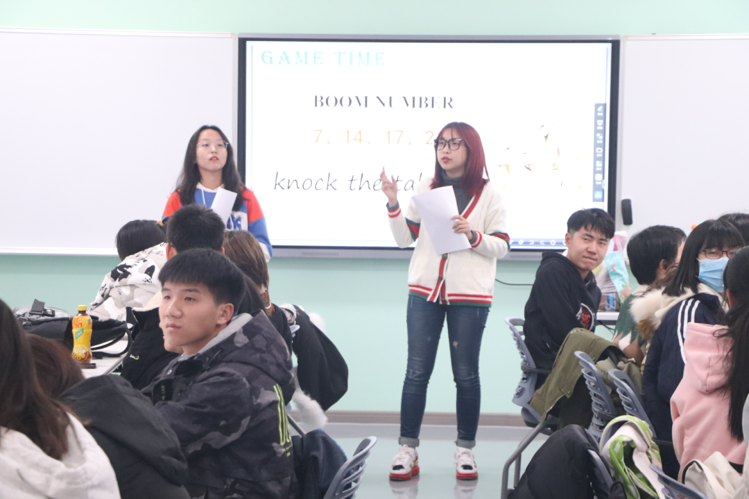 活動(dòng)之初,主持人對(duì)每一位同學(xué)的到來表示歡迎,讓同學(xué)們感受到了濃濃的暖意。為了使同學(xué)們?cè)诜潘缮硇牡耐瑫r(shí)提高英語能力,本期英語角在小游戲“Boom number”的渲染下熱烈而有序地展開。清脆的敲桌聲與歡快的笑聲,激動(dòng)人心的數(shù)字接龍,加之美味的零食……明亮的教室顯得格外溫馨。