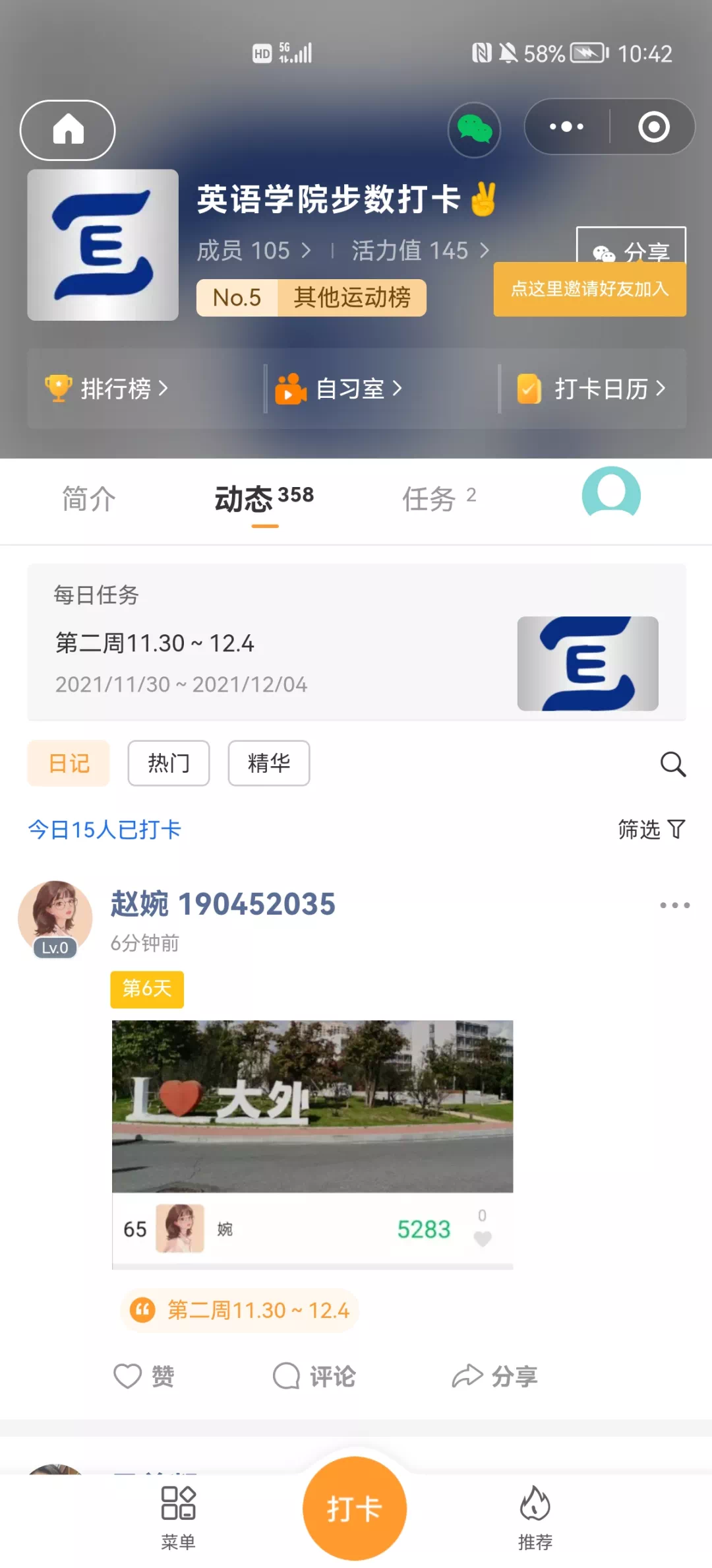 歲末將至,敬頌冬綏。本周,英語(yǔ)學(xué)院線(xiàn)上步數(shù)打卡活動(dòng)和線(xiàn)下趣味活動(dòng)相結(jié)合,積極開(kāi)展“‘疫’中一條心,‘E’起動(dòng)起來(lái)”主題趣味活動(dòng)。運(yùn)動(dòng)是不會(huì)讓人后悔的投資,當(dāng)你愛(ài)上運(yùn)動(dòng),健康也會(huì)愛(ài)上你。在網(wǎng)課期間,很多同學(xué)缺少鍛煉,此次活動(dòng)正激發(fā)了同學(xué)們鍛煉體魄的熱情,同學(xué)們的每一份堅(jiān)持,每一份努力都在為良好的身體素質(zhì)打下基礎(chǔ)。