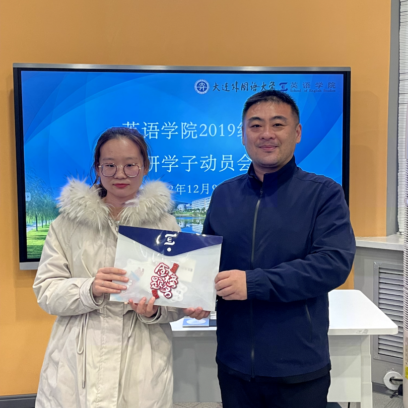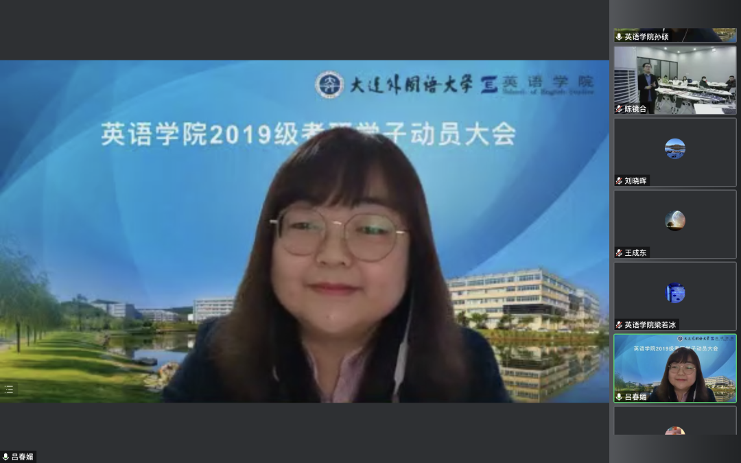 12月9日下午,為鼓勵(lì)即將邁入考場的2019級考研學(xué)子,英語學(xué)院以線上線下相結(jié)合的方式舉行了考研學(xué)子考前動員會。本次動員會由黨委副書記兼紀(jì)委書記孫碩主持,院長呂春媚、英語學(xué)院黨委梁若冰副書記、副院長曲濤、副院長劉曉暉、副院長王成東、英語學(xué)院團(tuán)委書記兼2019級輔導(dǎo)員曲鏡達(dá)、2019級輔導(dǎo)員吳曼、2021級輔導(dǎo)員達(dá)尼亞爾江·亞力坤江以及研究生輔導(dǎo)員黃新智參與此次動員會。