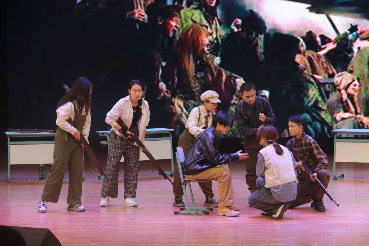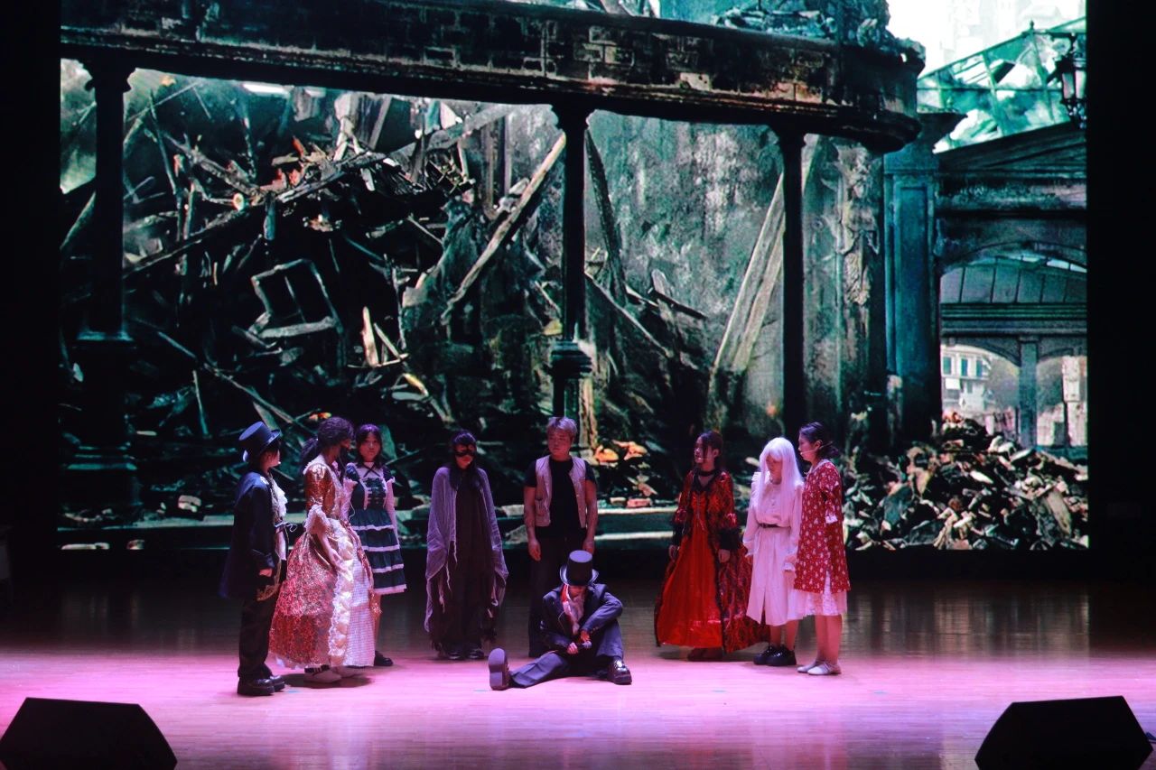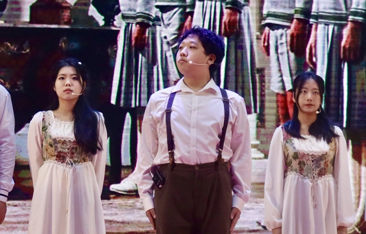 2023級劇組帶來的《悲慘世界》拉開了本次展演的帷幕。本劇目主要講述了以ABC社團(tuán)為代表的革命成員在法國大革命前夕與間諜沙威和敵軍發(fā)生激烈沖突的故事,展現(xiàn)出了大革命前后那個政權(quán)更迭、社會動蕩、民不聊生的悲慘世界景象。在表演的過程中,演員們?nèi)橥度耄曊{(diào)高亢激昂,讓觀眾們身臨其境地感受那個充斥著尖銳階級矛盾的法國社會。