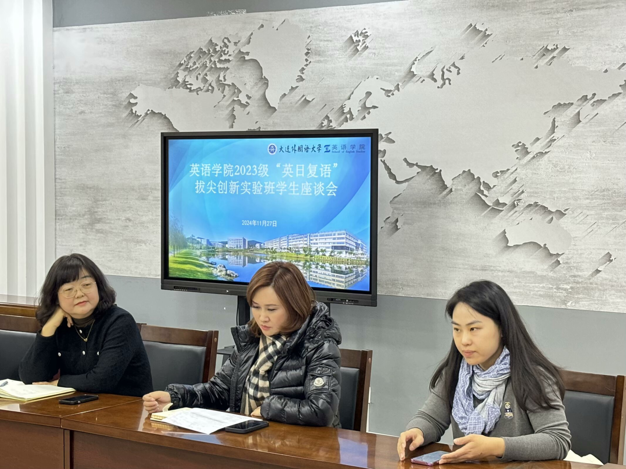 為進一步增強語言學(xué)科專業(yè)建設(shè),培養(yǎng)更多復(fù)合型國際化外語人才,11月27日,英語學(xué)院于勵業(yè)樓愛爾蘭研究中心召開2023級“英日復(fù)語”拔尖創(chuàng)新實驗班學(xué)生座談會。本次會議由英語學(xué)院2023級輔導(dǎo)員吳曼主持,英語學(xué)院黨委書記梁若冰、院長呂春媚、黨委副書記兼紀(jì)委書記孫碩、副院長羅俏鵑、教學(xué)秘書趙謙及25位實驗班同學(xué)出席本次會議。