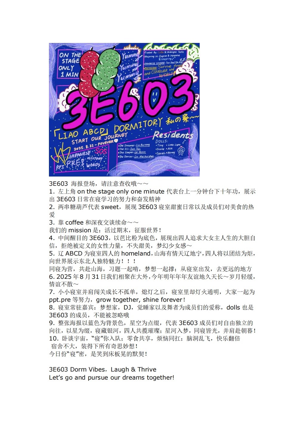 本次活動(dòng)不僅豐富了同學(xué)們的課余生活,更增強(qiáng)了寢室凝聚力,為大學(xué)生活留下了一段溫暖而精彩的回憶。希望在未來,這份用英語講述寢室故事、用創(chuàng)意裝點(diǎn)共同家園的熱情能夠延續(xù),讓每一間寢室都成為文化交流的微縮窗口,讓“E”路同行的陪伴,成為每位英院學(xué)子大學(xué)生活中最溫暖的注腳。