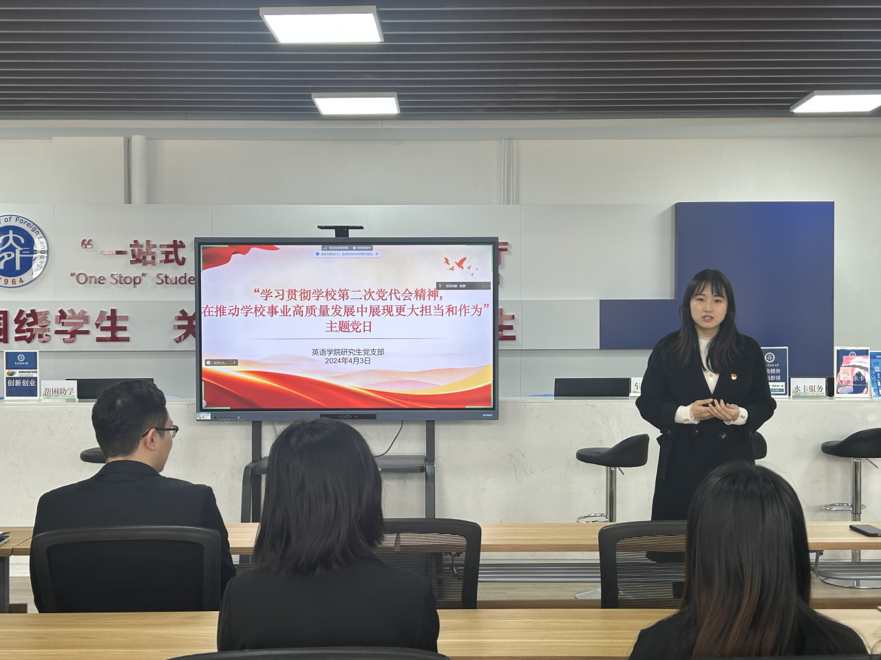 為深入貫徹落實(shí)學(xué)校黨委的工作部署,4月3日下午,英語(yǔ)學(xué)院各支部組織黨員開(kāi)展了以“學(xué)習(xí)貫徹學(xué)校第二次黨代會(huì)精神,在推動(dòng)學(xué)校事業(yè)高質(zhì)量發(fā)展中展現(xiàn)更大擔(dān)當(dāng)作為”為主題的黨日學(xué)習(xí)。