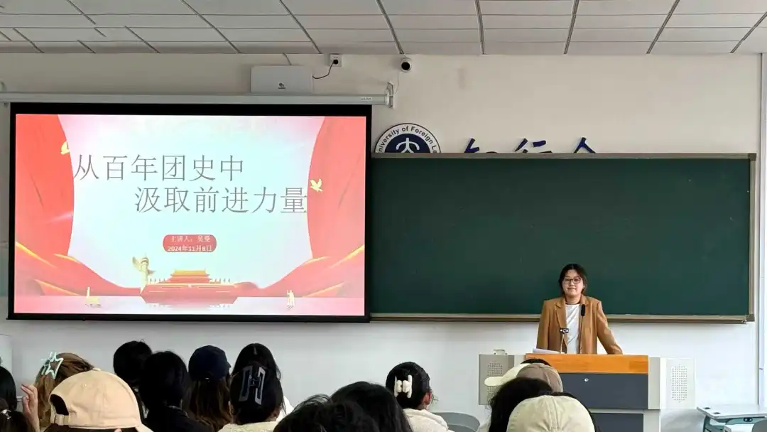 在第四講的課堂上,英語(yǔ)學(xué)院2023級(jí)輔導(dǎo)員吳曼為入團(tuán)積極分子帶來(lái)“從百年團(tuán)史中汲取前進(jìn)力量”專(zhuān)題課程。本次課程涵蓋共青團(tuán)的概況、共青團(tuán)的發(fā)展歷史以及共青團(tuán)的先鋒模范作用三方面內(nèi)容。吳曼老師首先介紹了團(tuán)的基礎(chǔ)知識(shí),并進(jìn)一步解釋了共青團(tuán)員的義務(wù)與權(quán)利之間的辯證關(guān)系。同時(shí),吳曼老師對(duì)共青團(tuán)的光輝歷史進(jìn)行詳細(xì)梳理,使入團(tuán)積極分子對(duì)共青團(tuán)發(fā)展的光輝歷程有了更深刻的認(rèn)知。“百年波瀾壯闊,百年青春激昂,吾輩當(dāng)自強(qiáng)”,這是吳老師對(duì)入團(tuán)積極分子的深切期望,她列舉多位青年楷模的模范事例,激勵(lì)同學(xué)們?cè)谛聲r(shí)代賡續(xù)紅色基因、傳承紅色精神,逐步成長(zhǎng)為社會(huì)主義事業(yè)的合格建設(shè)者和可靠接班人。