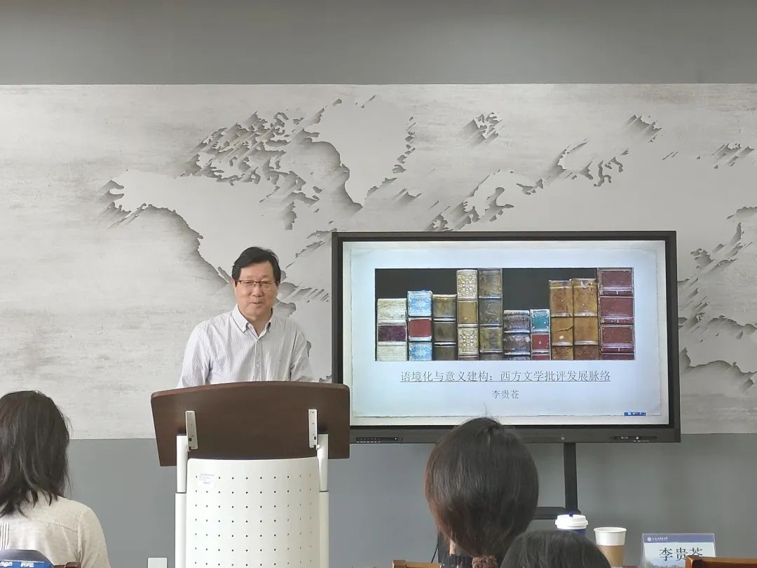 為進(jìn)一步落實(shí)我校“學(xué)術(shù)提升年”工作,促進(jìn)學(xué)術(shù)交流,英語學(xué)院于6月2日邀請大連外國語大學(xué)啟航學(xué)者李貴蒼教授在愛爾蘭研究中心為師生做了題為“語境化與意義建構(gòu):西方文學(xué)批評發(fā)展脈絡(luò)”的學(xué)術(shù)講座。本次講座為啟航學(xué)者新文科研究系列講座之一,由學(xué)院外國文學(xué)研究所所長李文萍教授主持,外國文學(xué)研究團(tuán)隊成員、部分專任教師、碩士研究生及本科生共同聆聽了此次講座。