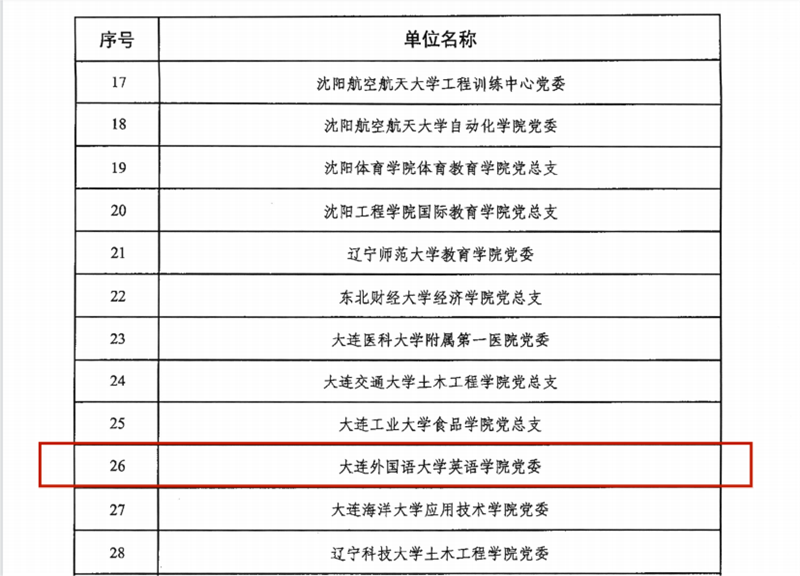 在黨的二十大即將召開(kāi)之際,我校黨建工作喜報(bào)頻傳。近日,在遼寧省委教育工委公布的高校黨建工作評(píng)選結(jié)果中,英語(yǔ)學(xué)院黨委獲批“全省黨建工作標(biāo)桿院系”培育創(chuàng)建單位。