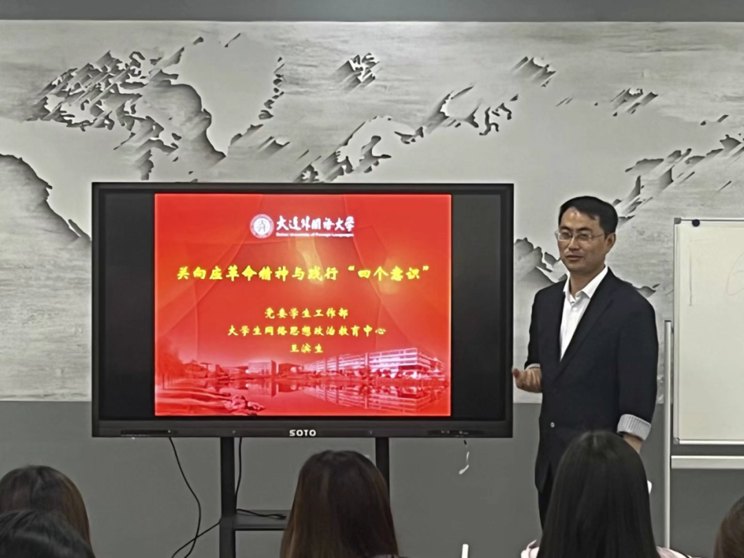 在第八講的課堂上,英語學院教工第一黨支部書記、副院長王成東為同學們帶來“淺談紅色文化與文化自信”專題課程。