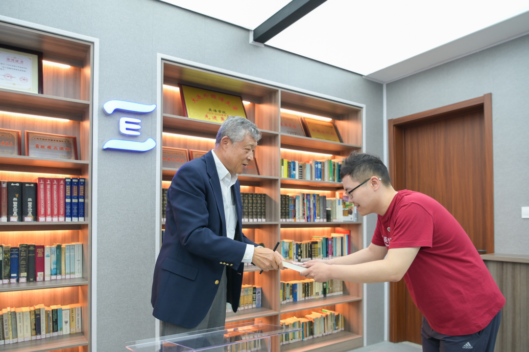 參觀結(jié)束后,大使學(xué)長(zhǎng)一行參加“一段大外路 一生大外情”師生座談會(huì),劉宏校長(zhǎng)與英語(yǔ)學(xué)院、高級(jí)翻譯學(xué)院師生代表一道參與座談。座談會(huì)伊始,由英語(yǔ)學(xué)院喻冬老師指導(dǎo)的The Seekers樂(lè)隊(duì)獻(xiàn)唱原創(chuàng)英文歌曲 “Welcome Home”,表達(dá)了對(duì)學(xué)長(zhǎng)回家的熱切期待。大使學(xué)長(zhǎng)回顧了在母校求學(xué)的青春歲月,感嘆了母校多年發(fā)展取得的豐碩成果,贊揚(yáng)了學(xué)校在教育教學(xué)方面的創(chuàng)新精神和不懈努力。與會(huì)師生代表踴躍提問(wèn),大使學(xué)長(zhǎng)結(jié)合自己的成長(zhǎng)經(jīng)歷、人生閱歷和外交實(shí)踐經(jīng)驗(yàn)進(jìn)行了分享。座談會(huì)結(jié)束后,他向英語(yǔ)學(xué)院師生現(xiàn)場(chǎng)簽名贈(zèng)書(shū),英語(yǔ)學(xué)院向大使學(xué)長(zhǎng)贈(zèng)送了1974屆畢業(yè)生合照,并合影留念。