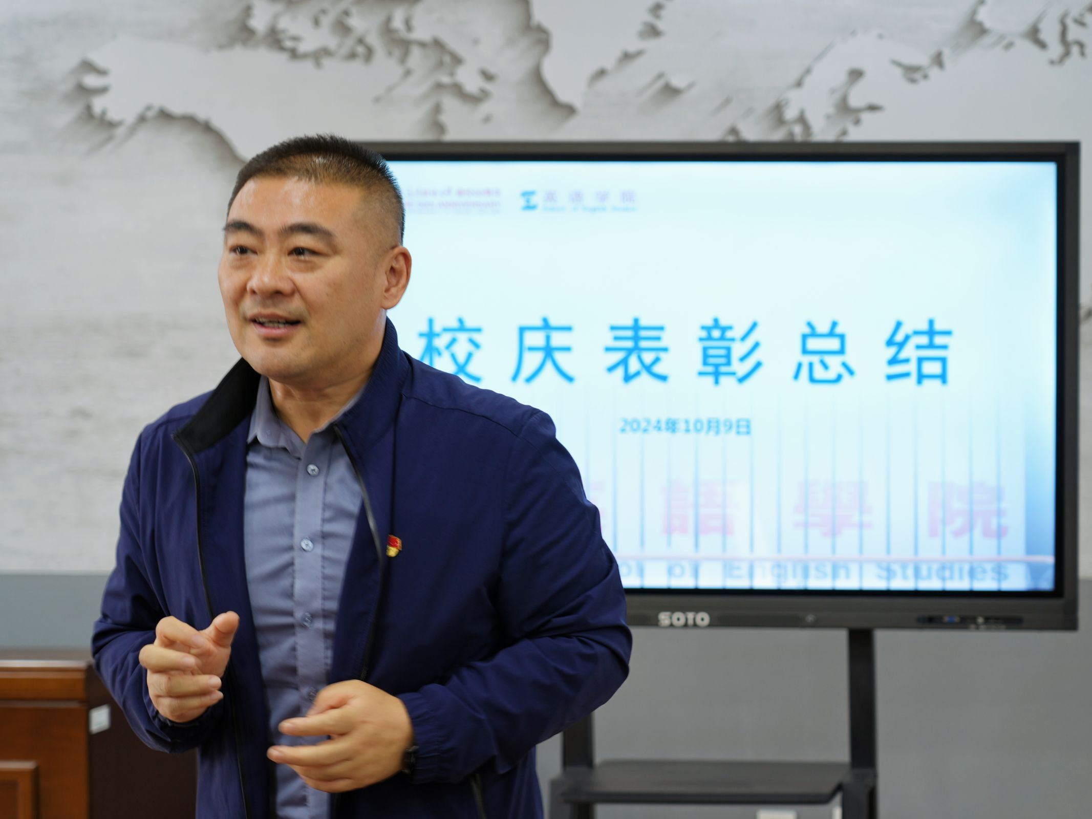 為進(jìn)一步加強(qiáng)學(xué)院建設(shè),總結(jié)英語(yǔ)學(xué)院師生在我校六十周年校慶的精彩表現(xiàn),并對(duì)學(xué)院各個(gè)部門工作進(jìn)行表彰,10月9日下午,英語(yǔ)學(xué)院在勵(lì)業(yè)樓愛爾蘭中心舉辦校慶工作總結(jié)會(huì)暨表彰大會(huì)。本次會(huì)議由英語(yǔ)學(xué)院黨委副書記兼紀(jì)委書記孫碩主持,英語(yǔ)學(xué)院團(tuán)委書記兼2023級(jí)輔導(dǎo)員曲鏡達(dá)、2021級(jí)輔導(dǎo)員達(dá)尼亞爾江·亞力坤江、2022級(jí)輔導(dǎo)員李延奇、2023級(jí)輔導(dǎo)員吳曼、2024級(jí)輔導(dǎo)員王藝凝出席此次會(huì)議。