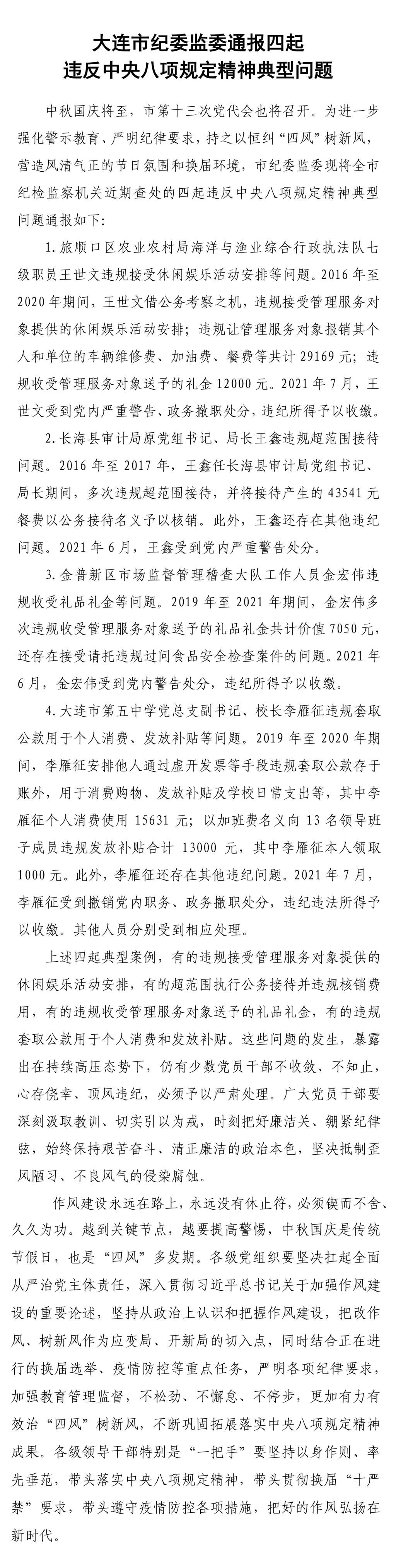 以案為鑒第十期:大連市紀(jì)委監(jiān)委關(guān)于四起違反中央八項(xiàng)規(guī)定精神典型問題的通報(bào)