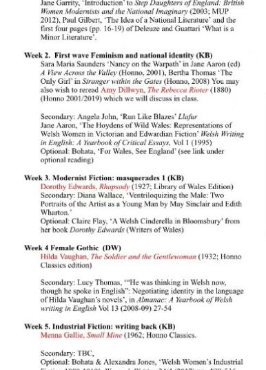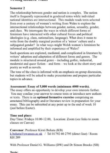 威爾士文學(xué)的相關(guān)課程是斯旺西大學(xué)的特色課,主要關(guān)注后殖民主義、女性主義和本土化書寫。從中我們可以感受在“性別”和“族裔”的雙重邊緣身份背景下,威爾士女性文學(xué)的雙重破格力量。