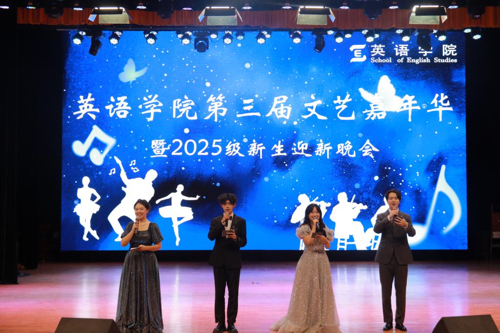 絲竹繞梁,翰墨飄香;熠熠生輝,文脈綿長。為展現(xiàn)英院學子青春風采、豐富同學們的課余生活、培育健康向上的文化氛圍,12月5日晚,英語學院第三屆文藝嘉年華暨2025級新生迎新晚會于大學生活動中心禮堂順利舉辦。英語學院黨委書記梁若冰、黨委副書記兼紀委書記孫碩、副院長羅俏鵑、團委書記兼2023級輔導員曲鏡達、研究生輔導員黃新智、2022級輔導員李延奇、2023級輔導員吳曼、2025級輔導員達尼亞爾江·亞力坤江、教學秘書馬雪嬌及英語學院師生代表出席本次活動。